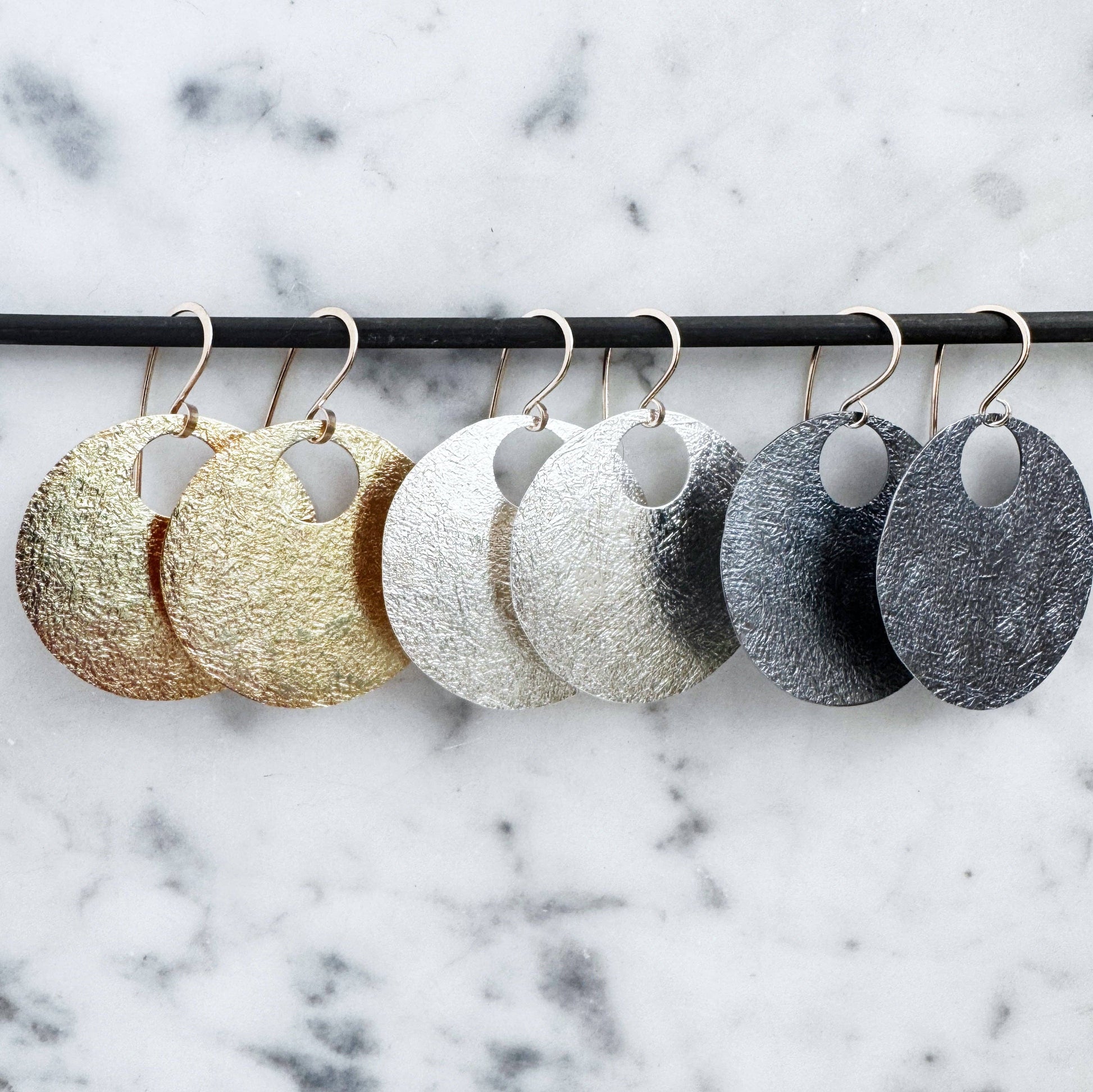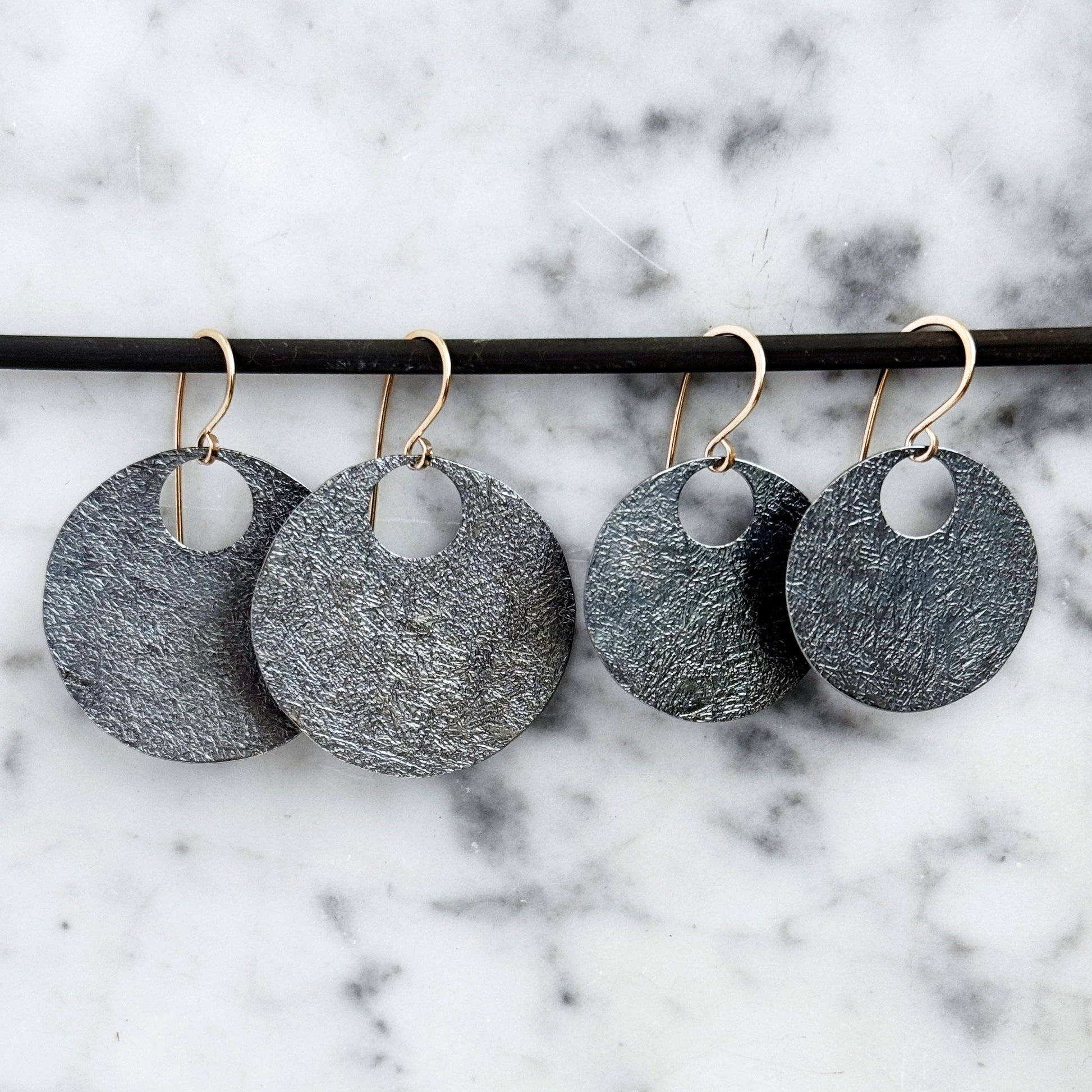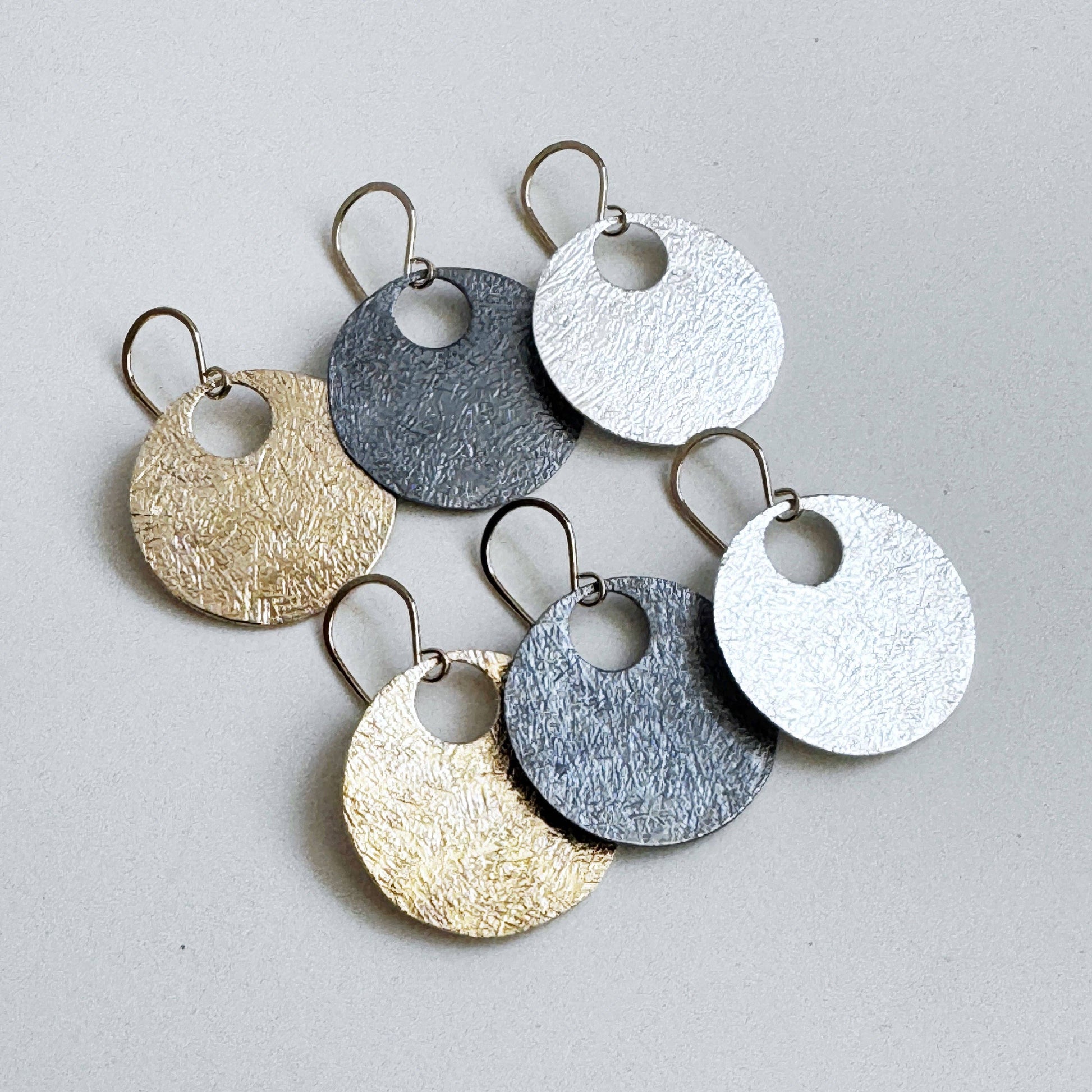 I always, always go back to basics and return to circles. I can’t avoid it. These classic, simple beauties will be something you reach for again and again. Hand textured with my trusty favorite hammer, these are available in two sizes and three finishes- bright or oxidized silver with 14k goldfill earwires or all 14k goldfill.